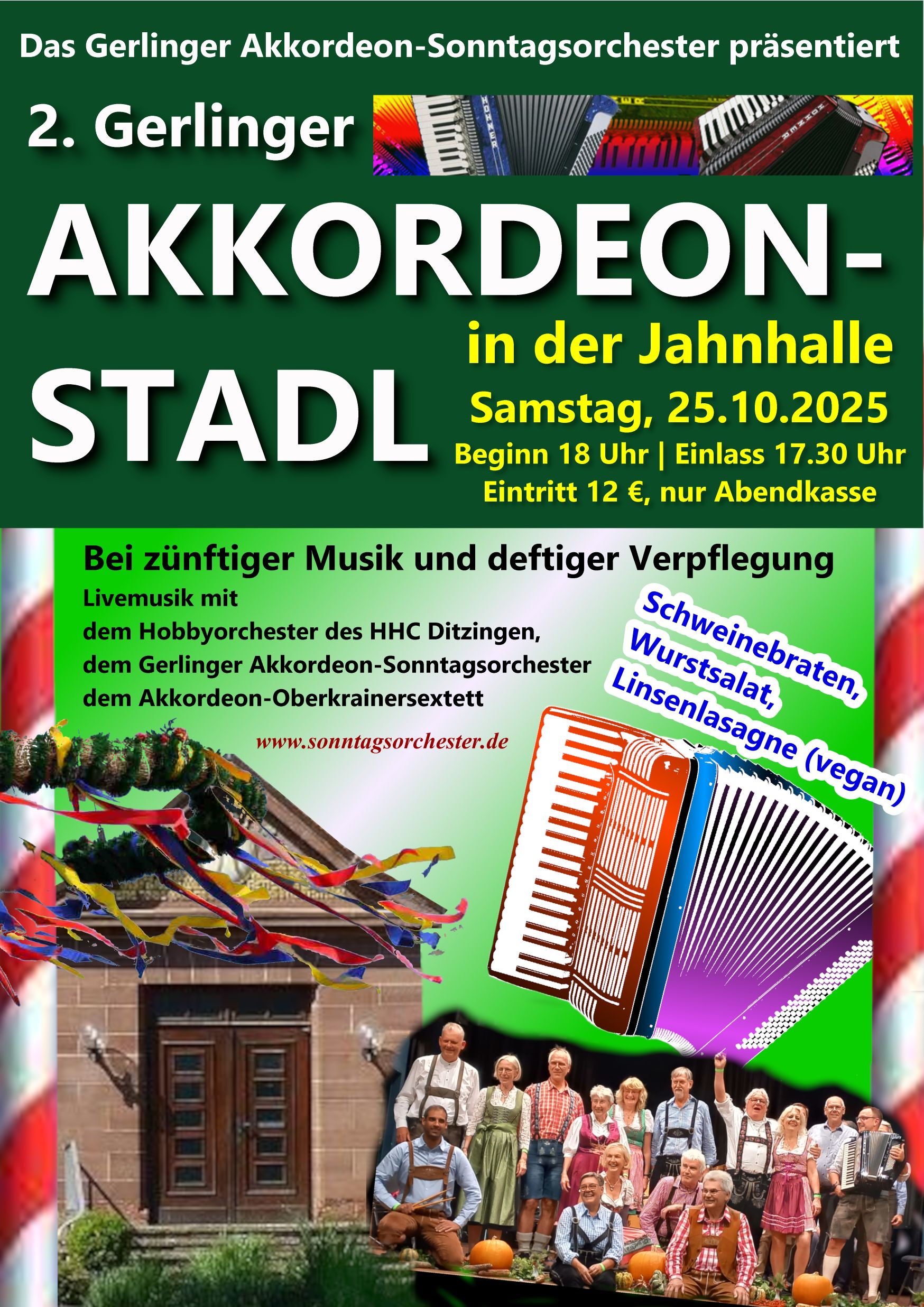 Mit dem „Akkordeonstadl“ möchte das Gerlinger Akkordeon-Sonntagsorchester alle Liebhaber der Akkordeonmusik ansprechen und wieder für eine vollbesetzte Jahnhalle sorgen. Das Konzept ist denkbar einfach: Eine herbstlich geschmückte Jahnhalle, Livemusik von zwei Akkordeonorchestern (aus Ditzingen und Gerlingen) und einem Akkordeon-Oberkrainer-Sextett, dazu Schweinebraten und Wurstsalat und Linsenlasagne vom Team der Grimmler Alm. Die meisten der Musiker und Gäste kommen natürlich in Tracht.